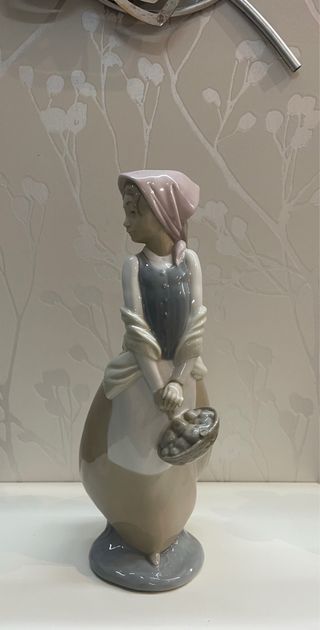 Figura de porcelana de una niña con una cesta, de la marca Nao by Lladró. - Diseño delicado y detallado. - Tonos suaves y acabados de calidad. Figura descatalogada Mide 25 cm En la última foto se puede ver que le falta el asa de la cesta.