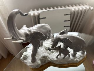 Preciosa figura de porcelana de una familia de elefantes de Lladro. Representa a un elefante adulto con sus crías. - Diseño detallado y elegante. - Acabado brillante en tono grisáceo. En la fotografía se observan pequeñas roturas . De ahi su precio . Coleccion precio es mas de 500€. Solo entrega en mano