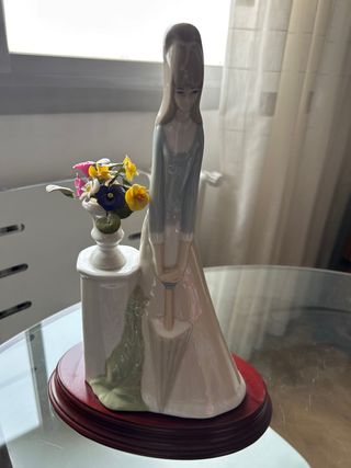 Figura de porcelana de Lladró que representa a una mujer con un paraguas y un jarrón con flores. - Diseño elegante y detallado. - Base de madera oscura. - Altura aproximada: 35 cm. - Ancho aproximado: 18 cm.