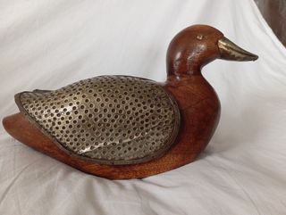 Pato grande de madera maciza y alas de metal, antiguo . Aspecto envejecido . Longitud 31,5 cm. ancho 13,5 cm. y alto 16 cm . Buen regalo para Navidad.