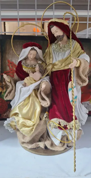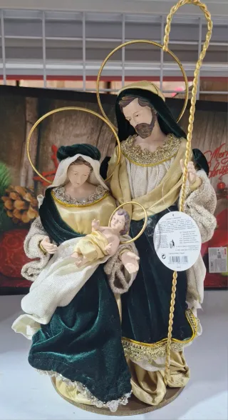 Figura decorativa del Nacimiento de Jesús, representando a la Sagrada Familia. Ideal para la temporada navideña. - Figuras de María, José y el Niño Jesús. - Detalles dorados y tela de terciopelo verde. - Aros dorados como aureolas. Se hacen envíos, precios de fábrica.