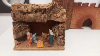 Precioso nacimiento en miniatura, ideal para decorar en Navidad. - Paisaje detallado con casitas, puente y río. - Figuras de personas y ovejas. - Elementos naturales como corteza y musgo.