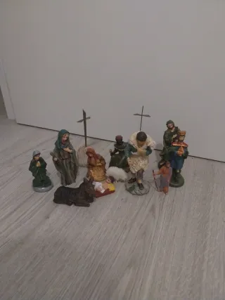 Conjunto de figuras para un belén de Navidad antiguo. Incluye varias piezas con detalles. - Figuras de personajes. - Elementos decorativos.