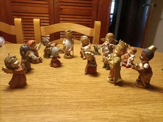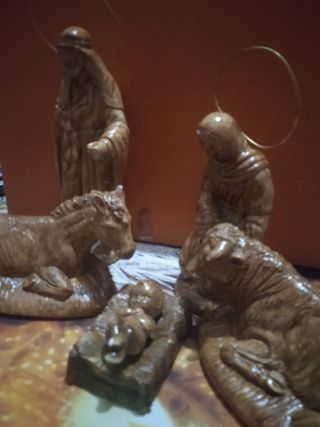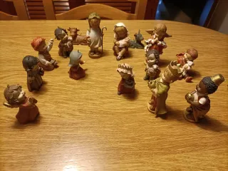 Precioso belén navideño compuesto por diez figuras de resina. Ideales para decorar en Navidad. - Incluye figuras de la Sagrada Familia, ángeles, pastores y animales. - Figuras pintadas a mano con detalles delicados. - Material: resina. - Perfecto estado.NO se hace envío.