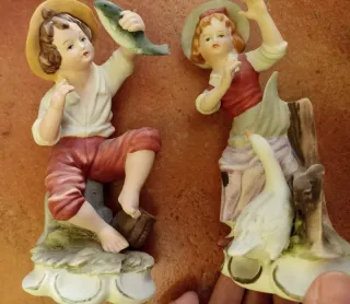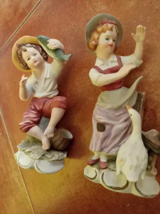 Conjunto de dos figuras vintage de porcelana, representando a un niño pescando y una niña con un ganso. - Figura de niño con sombrero de paja, camisa blanca y pantalón rojo, sosteniendo un pez. - Figura de niña con sombrero, chaleco rojo y falda lila, junto a un ganso blanco y un tronco. Precioso regalo Navidad, Reyes.