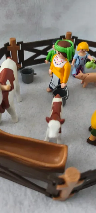Set de Playmobil de granja con figuras de pastores y animales. - Incluye figuras de personas. - Figuras de vacas y terneros. - Accesorios de granja como cubos y horca. - Valla de corral. - Planta con zanahorias. Familia compuesta por padre con fardo de paja madre con cubo hijo hija y cerdito vaca ternera y complementos de granjero medieval Pastor pastorcito hombre medieval navidad navidades pastora pastorcita portal de Belén granjero granja de Playmobil