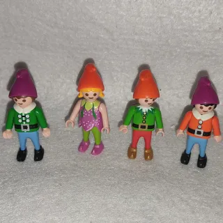 Conjunto de cuatro figuras de Playmobil con gorros de elfo o duende de Papá Noel y Navidad - Figuras de niños y niñas con gorros naranjas. - Diseños variados de ropa.