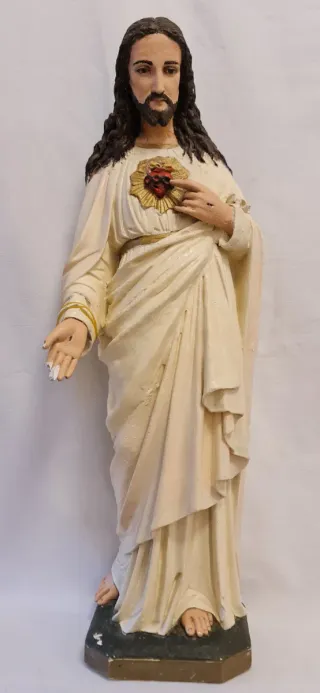 OPORTUNIDAD Liquidación por Navidad: Figura GRANDE del Sagrado Corazón de Jesús (siglo XX), con mano derecha para restaurar apreciable en las fotografías (de ahí su precio). Medidas: 64 cm. de alto x 24 cm. de ancho x 21 cm. de fondo