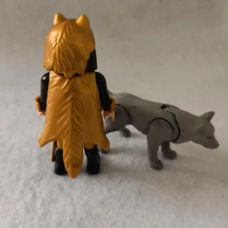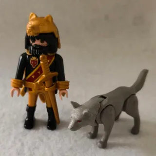 Figura de Playmobil de un aldeano o pastor con túnica y tocado de piel dorado con su lobo. - Figura de aldeanos o pastor con casco de lobo. - Incluye espada dorada tipo Guerrero - Figura de lobo gris. Ideal para el Portal de Belén de Navidad