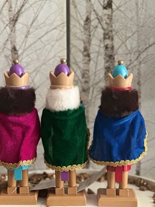 Conjunto de tres figuras de Reyes Magos, ideales como decoración navideña. - Cada figura lleva una corona con una esfera. - Uno de los Reyes Magos sostiene un cetro azul. - Los Reyes Magos portan regalos de madera. - Vestimentas de colores vibrantes: azul, morado y rojo. Reyes Magos Navidad Cascanueces Papá Noel Melchor Gaspar y Baltasar