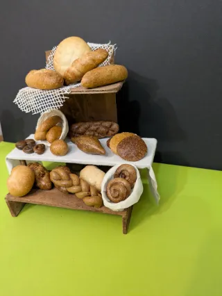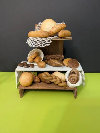 Conjunto de panes artesanales para belén. Variedad de panes y bollos. - Texturas y acabados realistas. - Ideal para figuras de 12 hasta 15 cm. Figura de la foto 15 cm no incluida # puesto pan panes Belén pesebre navidad dioramas escenas escenografias paradas mercado