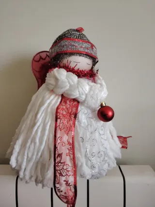 Figura de ángel decorativa para Navidad. Ideal para dar un toque festivo a tu hogar. - Diseño con alas rojas. - Vestimenta blanca con detalles plateados. - Adornado con cintas rojas y un pequeño adorno esférico.