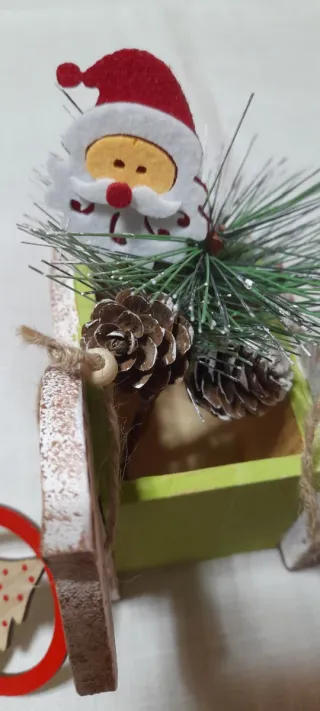 Adorno navideño perfecto para lapicero o caramelero, ideal para los más pequeños. CARRO con 2 caballitos pintados a mano. Viene con el agregado de Papá Noel y está decorado con piñas y ramas de pino. Ademas 2 figuras decorativas colgantes para el arbolito - Incluye piñas y ramas de pino. - Base de madera
