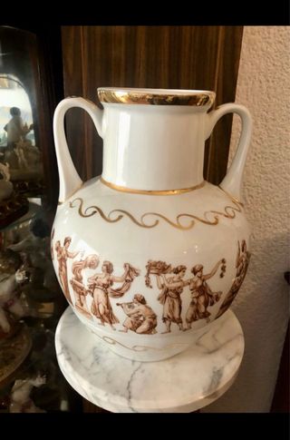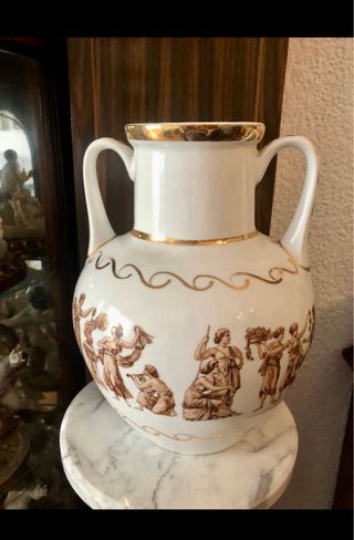 Jarrón porcelana policromada en oro. Motivos: figuras griegas. Perfecto estado. Marca en la base. Medidas: 30 x 22 cm.