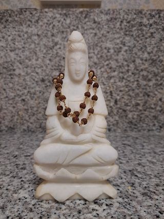 Figura de mármol blanco de la diosa de la misericordia en China viene con un collar de una semilla con oro de 18 kl. Peso de 800 gramos y 18,50 cm de alto por 10 cm de ancho.