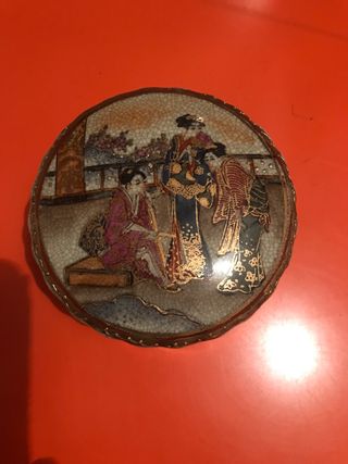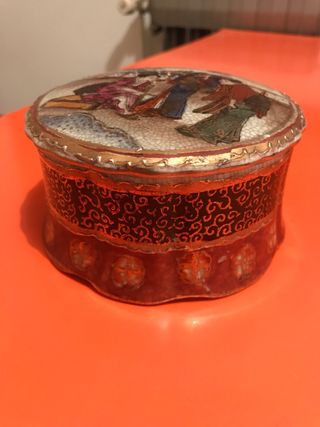 Preciosa caja antigua de porcelana china con un diseño detallado de figuras. joyero o bombonera - Decoración con escenas de la vida tradicional. - Bordes dorados y acabado craquelado. En oro - Pieza decorativa de estilo oriental. - diametro 12 cm / altura 6 cm Entrega en barcelona i valldoreix sant cugat