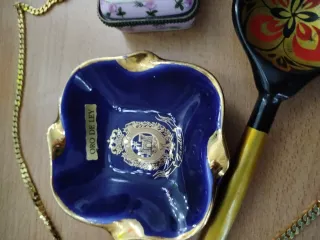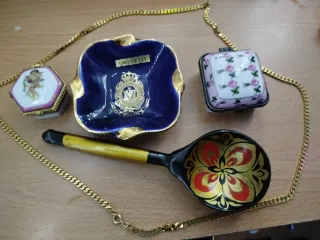 Conjunto de piezas de porcelana decorada y un collar Regalo - Cuenco de porcelana azul con detalles dorados y escudo. - Caja cuadrada de porcelana con diseño floral. - Pequeña caja hexagonal de porcelana con figura de querubín. - Cuchara decorada con motivos florales. - Collar de cadena