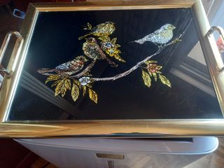 Bandeja decorativa con un diseño de pájaros sobre una rama. - Marco metálico dorado. - Fondo negro brillante. - Figuras de pájaros y flores con detalles dorados y plateados. 45x 35 Cm Se Puede ver sin compromiso No Acepto Cambios Entrego en el Metro de San Lorenzo Linea 4 de Metro Tambien Hago Envios Se Puede pagar con Bizum