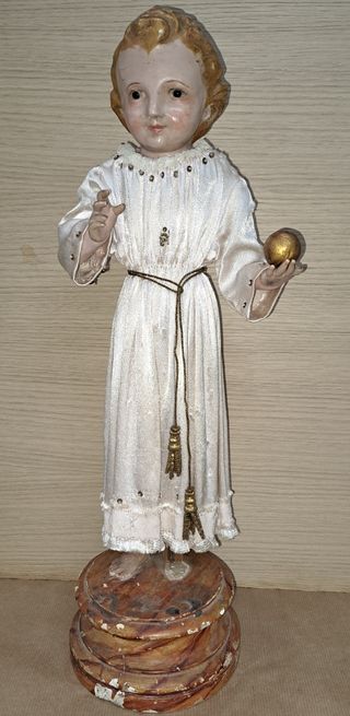 Niño Jesús de Praga, o niño de la bola, Capipota, cap i pota. siglo XIX Talla de madera, ojos de cristal, figura de vestir con adornos en hilo de oro, a la figura le falta parte de un pie y un dedo y medio de la mano izquierda, también tiene retoques en la frente, la peana tiene agujeros de carcoma pero esta desinfectado, mide 47,5 cm de altura total y 40 cm sin contar la peana. El estado es tal y como se puede ver en las fotos, estas son parte de la descripción.
