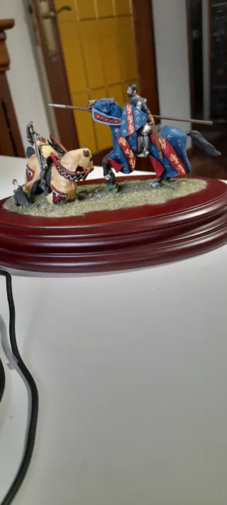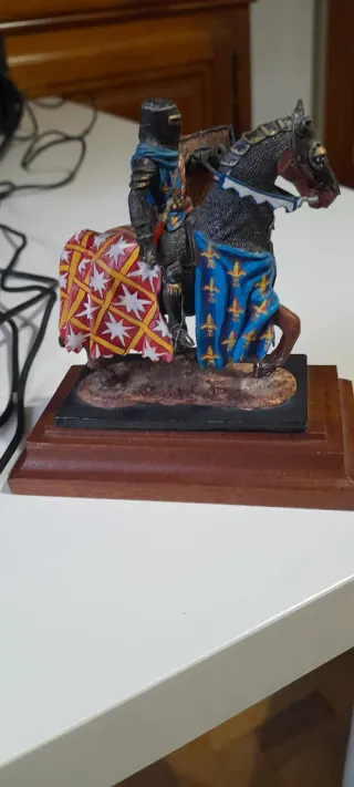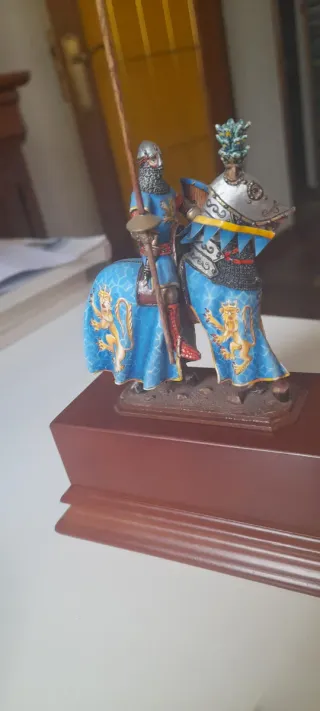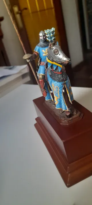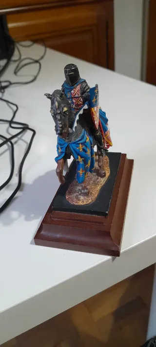 Figura de colección de un caballero medieval a caballo, escala 54mm. - Detallada armadura y estandarte. - Base de madera pulida. Andrea.