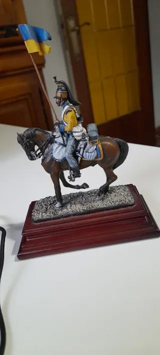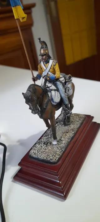 Figura de colección de un soldado de plomo a caballo, escala 54mm. - Figura detallada de soldado y caballo. - Base de madera para exposición.