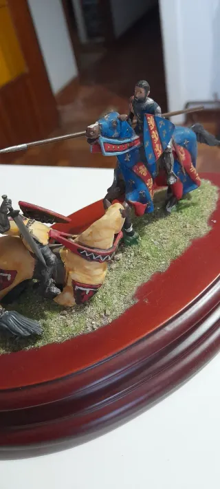 Figura de colección de un soldado de plomo representando un torneo medieval. La pieza está montada sobre una base escenificada con césped y detalles. - Soldado a caballo con lanza y escudo. - Base decorada con temática medieval.