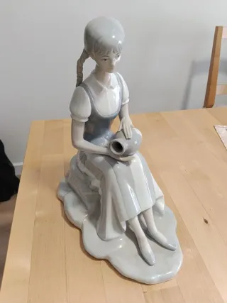 Figura de porcelana de una joven con un jarrón, obra del artista Miquel Requena. Tiene un dedo roto - Diseño detallado de la figura. - Acabado en porcelana de alta calidad.