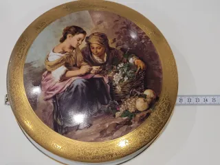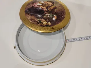 Elegante caja de porcelana con tapa decorada. - Borde dorado con diseño. - Ilustración de figuras y frutas en la tapa.