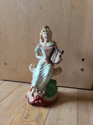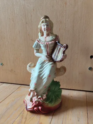 Figura vintage de mujer tocando la lira, fabricada en porcelana. Es una figura de porcelana esmaltada que representa a una mujer sentada tocando un instrumento de cuerda similar a una lira o arpa. Presenta un vestido blanco con detalles florales y un tocado, con un acabado brillante. La base tiene colores terrosos y detalles que sugieren un entorno natural o marino. El estilo sugiere que puede ser un artículo decorativo vintage, posiblemente de mediados del siglo XX. - Diseño detallado de mujer con vestido y corona. - Base decorada con flores y hojas.