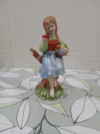 Figura decorativa de porcelana de una niña sentada en un árbol, sosteniendo una manzana y una cesta con frutas. 20 cm altura. En buen estado - Detalle de frutas en la cesta: uvas, manzanas, peras y melocotones. - Vestimenta: vestido azul y delantal naranja. - Base con césped y tronco de árbol.