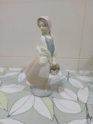 Figura de porcelana de una niña con un pañuelo en la cabeza y un vestido de época. Lleva una cesta en la mano.25 cm de altura en buen estado - Material: Porcelana. - Diseño: Niña con cesta. - Marca: Nao.