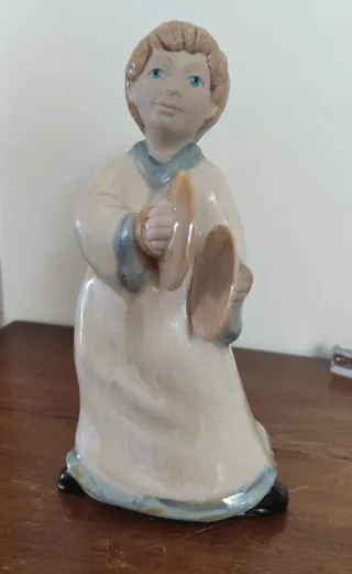 Figura de porcelana de un ángel músico tocando platillos. Alto 17 cm, pie 9 cm - Fabricado por Porcelana Artística Levantina. - Detalle de túnica con ribete azul. - Expresión facial dulce y ojos azules.