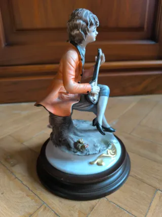 Figura de porcelana de Capodimonte, una pieza de colección. Peso 1040 gramos. - Detalle de músico tocando un instrumento. - Base decorada con partitura. - Fabricado en Italia.