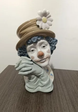 Precioso figura-busto de un payaso realizado por la reconocida marca Lladró. Realizada en porcelana esmaltada con acabado brillante. Titulada "Melancolía" o "payaso soñador", modelo; 5542 y diseñado por José Puche. Gran detalle en expresión así como en dedos entrelazados. Muy buen estado general, mínima marca en parte posterior de un pétalo y hoja (última foto ampliada) casi inapreciable. Fotos en detalle parte de la descripción. Medidas; Altura- 29cm, Peso- 2'100kg.
