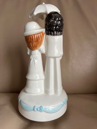 Solo por Correos. Encantadora figura de porcelana musical y giratoria que representa a una pareja bajo un paraguas. Ideal como detalle decorativo. - Figura de porcelana. - Diseño de pareja con paraguas. - Base decorada con cinta azul y lazo.