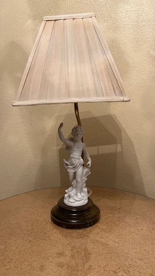 Elegante lámpara de sobremesa con una encantadora figura de porcelana Biscuit. La pantalla es de color beige claro y tiene un diseño plisado. La base es de madera. - Figura de porcelana Biscuit. - Pantalla plisada de tela. - Base de madera. - PRECIO NEGOCIABLE