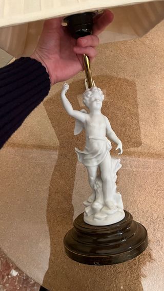 Elegante lámpara de mesa con una figura de ángel de porcelana blanca. - Base de madera oscura. - Pantalla de tela plisada.