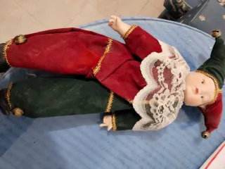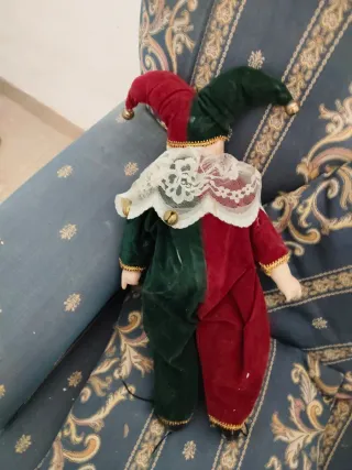Figura decorativa de arlequín. - Cuerpo de porcelana. - Vestimenta de terciopelo rojo y verde. - Cuello de encaje blanco con cascabeles. - Gorro de arlequín con cascabeles dorados.