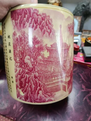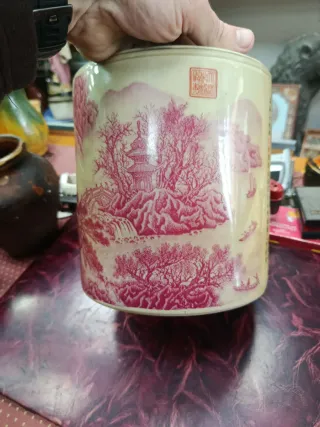 Cuenco chino de porcelana, antiguo,no sé exactamente de qué época, según el sello es del siglo XIX, pero no lo sé.Es de figuras rojas,lleva un poema tradicional y un sello con el nombre del ceramista.Mide 20x20 cm. Pesa 2700 gramos.Tal como se ve en las fotos,se puede recoger en mano en Jaén capital, Antigüedades Rivera,