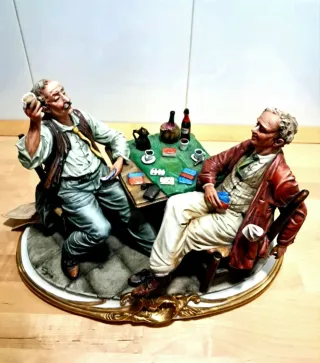 Preciosa figura de porcelana Capodimonte que representa a dos hombres jugando a las cartas. - Detallada escena de juego. - Figuras de porcelana. - Base decorativa.