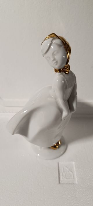 Preciosa figura de porcelana de una niña con una cesta. Es una pieza delicada y encantadora, ideal para coleccionistas o amantes de las figuras decorativas. - Figura de porcelana. - Representa a una niña con un vestido largo. - Lleva una cesta en la mano. - Diseño detallado y elegante.