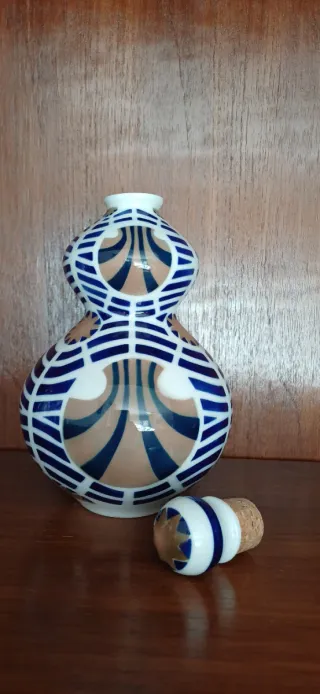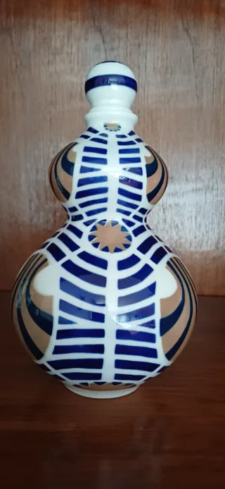 FIgura/botella de porcelana conocida como la "Calabaza Peregrino" de Sargadelos. Su diseño y decoración hacen referencia a las calabazas huecas (de la especie Lagenaria siceraria) que los peregrinos medievales usaban para transportar agua o vino durante el Camino de Santiago.