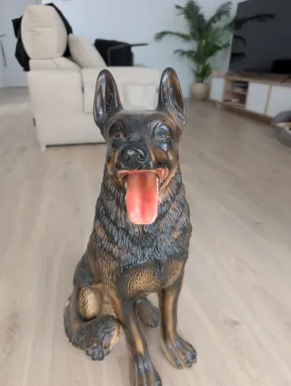 Figura decorativa de pastor alemán, elaborada en porcelana y datada del siglo XX. Una pieza con gran detalle. Se ve en la foto los desperfectos que se han ido arreglando. Medidas: 66 cm de alto x 40 de profundidad - Diseño realista de pastor alemán. - Material: Porcelana. - Época: Siglo XX.