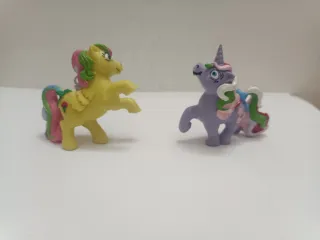 Lote de dos figuras de unicornios de PVC. De la colección My Little Pony-Mi Pequeño Poni - Unicornio amarillo con crin multicolor. - Unicornio morado con cuerno y detalles florales.