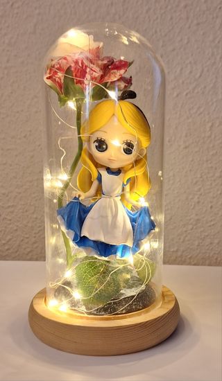 Figura de Alicia en el País de Las Maravillas con cúpula removible de cristal y luces Led, incluye pilas.