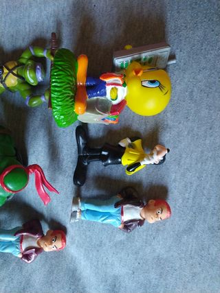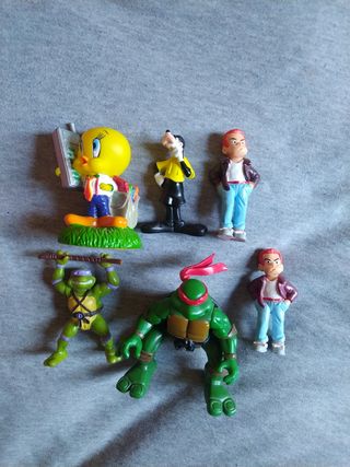 6 miniaturas ,figuras, figuritas de diferentes medidas. tortuga ninja de unos 10cm de plástico piolín de goma , de unos 9 cm la otra tortuga ninja 8 cm y Goofy de PVC, de unos 7 cm. punky 7 cm x 3,5 cm no hago envíos. más personajes en mi perfil. 8 € cada figura personajes Disney.