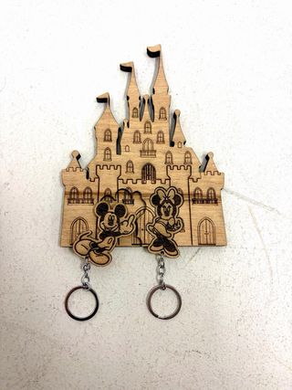 Original colgador de llaves con diseño de castillo disney. - Fabricado en madera. - Incluye figuras de Mickey y Minnie. - Dos anillas para llaves. Medidas: Alto:21cm Ancho:15cm