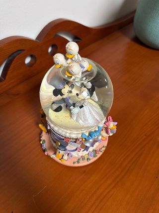 Bola de nieve de Disney con edición limitada. - Mickey y Minnie Mouse vestidos de novios. - Figuras de los sobrinos de Donald en la parte superior. - Base decorada con personajes y flores. Con musica