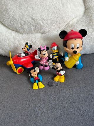 Conjunto de figuras de personajes de Disney. - Incluye a Mickey Mouse, Minnie Mouse, Donald y Goofy. - Vienen con accesorios como un avión y un biberón