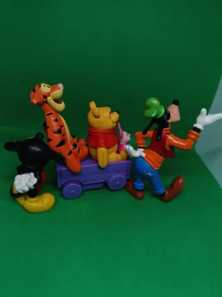 Conjunto de figuras de personajes clásicos de Disney. - Incluye a Mickey Mouse, Goofy, Winnie the Pooh, Piglet y Tigger. - Figuras de PVC. - Colores vibrantes.